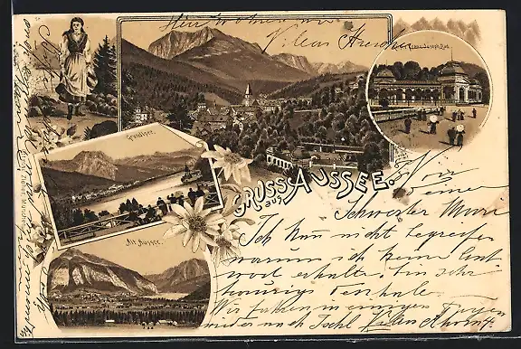 Lithographie Aussee, Kaiser Franz-Joseph-Bad, Grundlsee, Teilansicht, Steirerin in Tracht