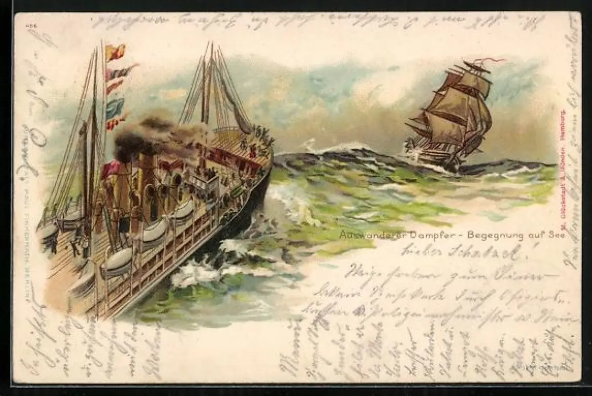 Lithographie Auswanderer-Dampfer und Segelboot begegnen sich auf See