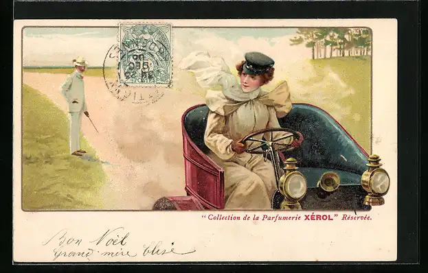 Lithographie Auto, Eine Dame am Steuer, Collection de la Parfumerie Xerol