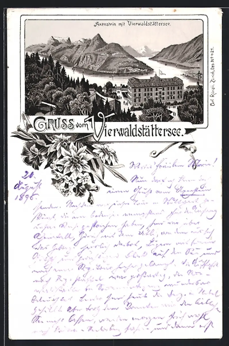 Lithographie Axenstein /Vierwaldstättersee, Axenstein mit Vierwaldstättersee und Hotel, Blumenstrauss