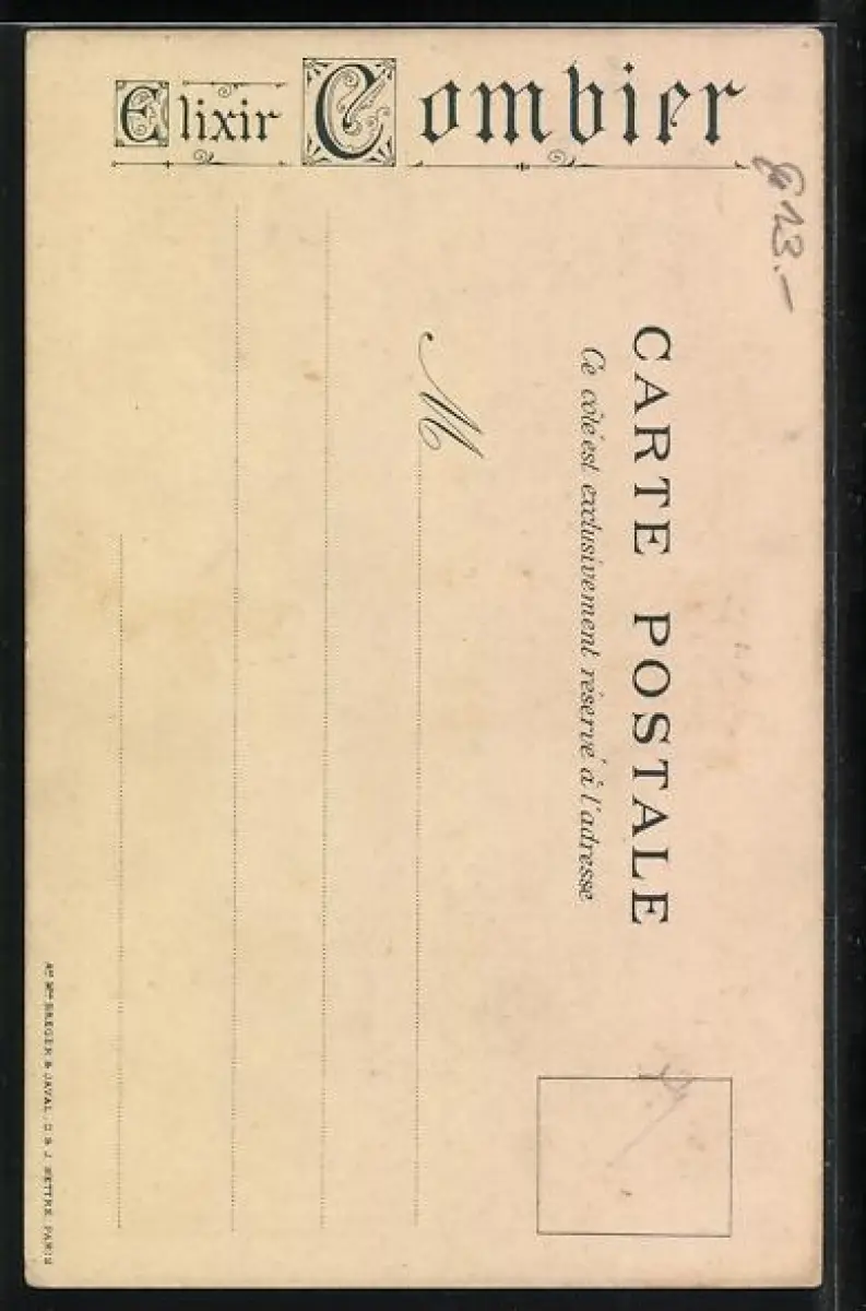 Lithographie Azay-le-Rideau, Schlosspartie, Flasche Elixir Combier, Maler malt Frau in Kleid mit Feder, Reiter