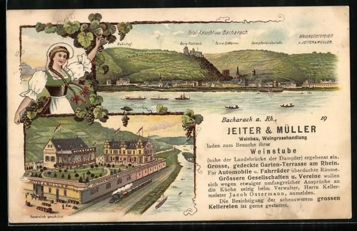 Lithographie Bacharach a. Rh., Restaurant und Weingrosshandlung Jeiter & Müller, Panorama mit Dampferlandestelle