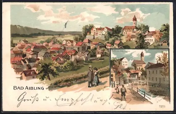 Lithographie Bad Aibling, Totalansicht, Partie im Ort
