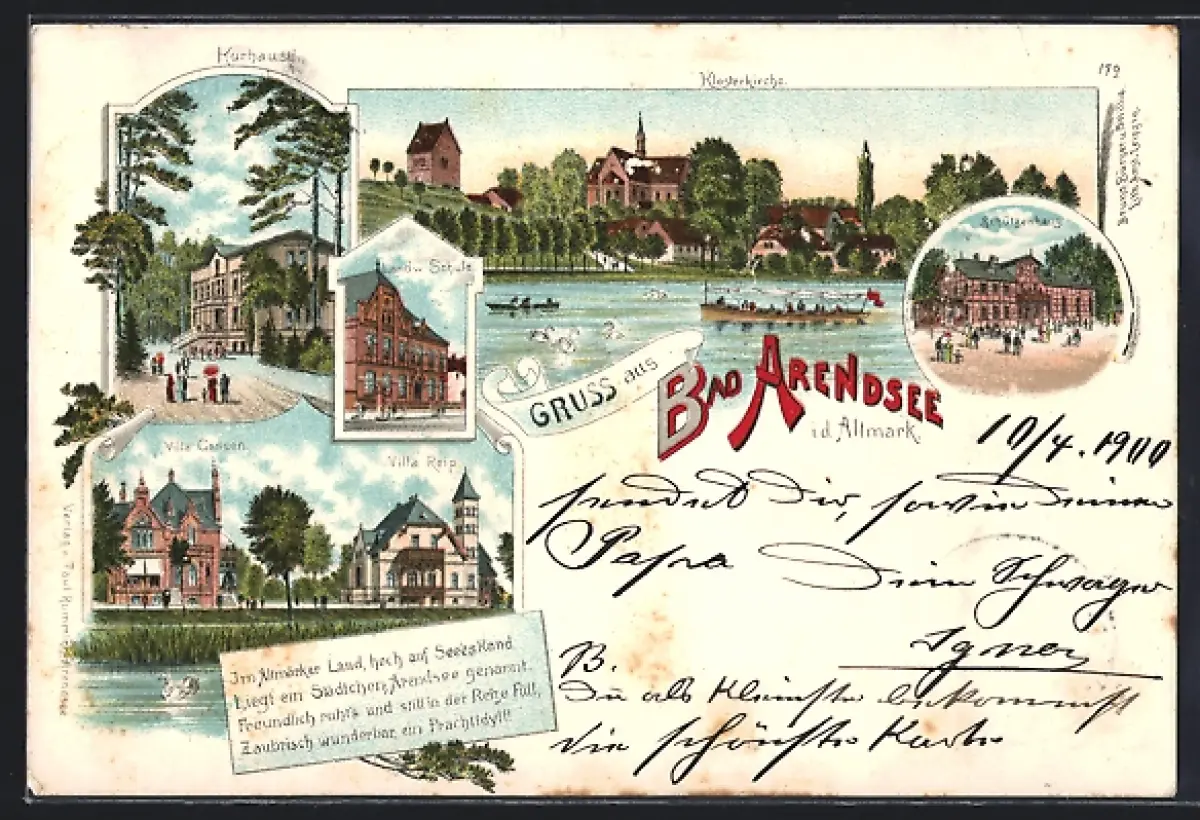 Lithographie Bad Arendsee i. d. Altmark, Gasthaus Schützenhaus, Kurhaus, Klosterkirche