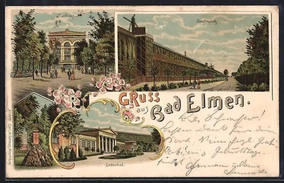 Lithographie Bad Elmen, Lindenbad, Denkmal, Kurhaus, Gradirwerk