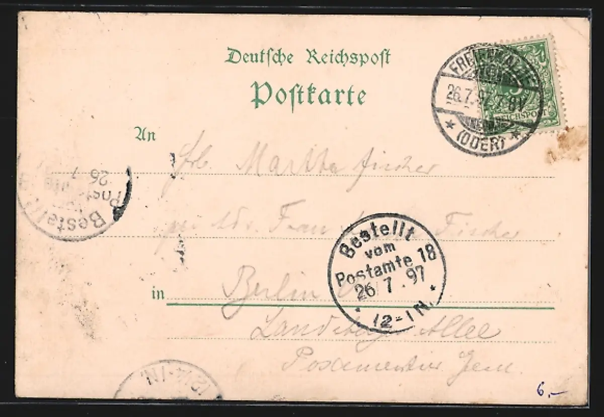 gelaufen 1897, Eckknicke links oben, Eckknick rechts unten, sonst guter Zustand