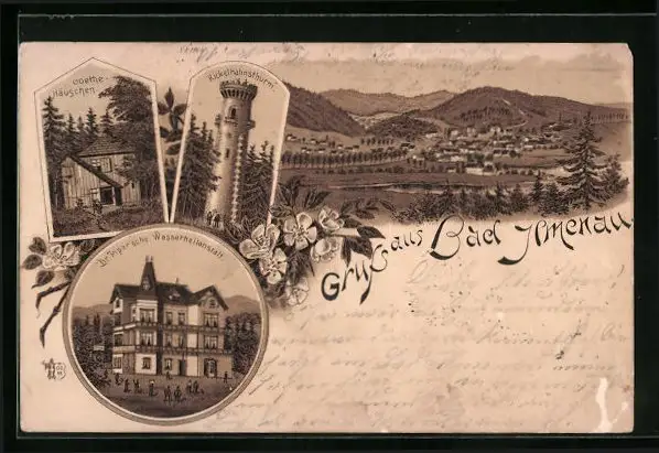 Lithographie Bad Ilmenau, Dr. Piper`sche Wasserheilanstalt, Kickelhahnsturm, Goethe-Häuschen