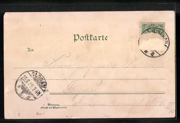 gelaufen 1899, Briefmarke tw. entfernt, rückseitig Oberflächenschaden, Stempelspur, Oberflächenschaden, guter Zustand