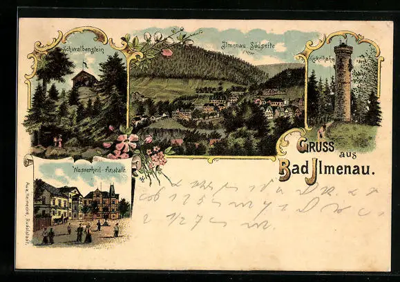 Lithographie Bad Ilmenau, Wasserheil-Anstalt, Kickelhahn, Schwalbenstein