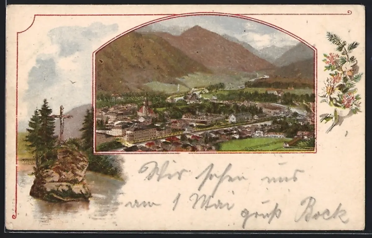 Lithographie Bad Ischl, Teilansicht mit Kirche, Jesuskreuz