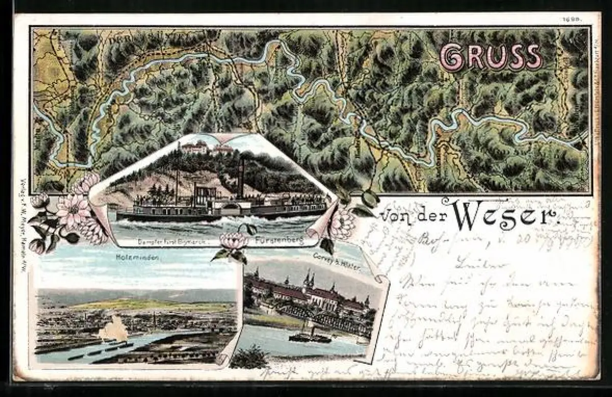 Lithographie Bad Karlshafen, Panorama & Dampfer Fürst Bismarck mit Landkarte des Weserlaufs