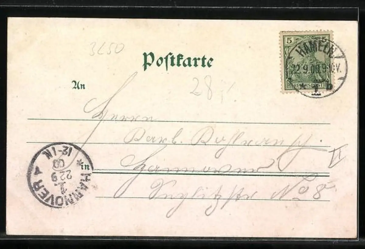 Personenbezogene Daten auf der Rückseite der Karte wurden durch blauen Textmarker unkenntlich gemacht. Die blauen Stellen sind auf die Vorderseite durchgeweicht und wirken sich negativ auf das Postkartenfoto aus