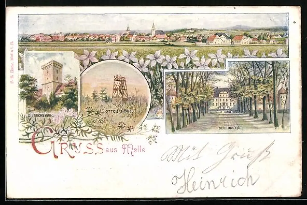 Lithographie Bad Melle, Gut Bruche, Otto's Höhe, Dietrichsburg, Totalansicht