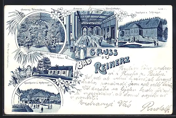 Lithographie Bad Reinerz, Gasthaus zur Schnappe, Inneres Palmenhaus, Innere Wandelbahn, Laue-Quelle und Molkenanstalt