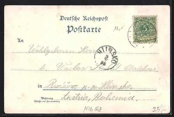 Personenbezogene Daten auf der Rückseite der Karte wurden durch blauen Textmarker unkenntlich gemacht. Die blauen Stellen sind auf die Vorderseite durchgeweicht und wirken sich negativ auf das Postkartenfoto aus
