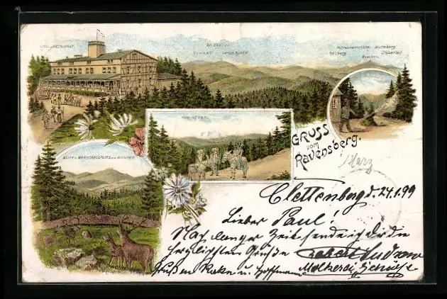 Lithographie Bad Sachsa, Hotel und Restaurant Ravensberg, brocken und Wurmberg, Kuck ins Tal
