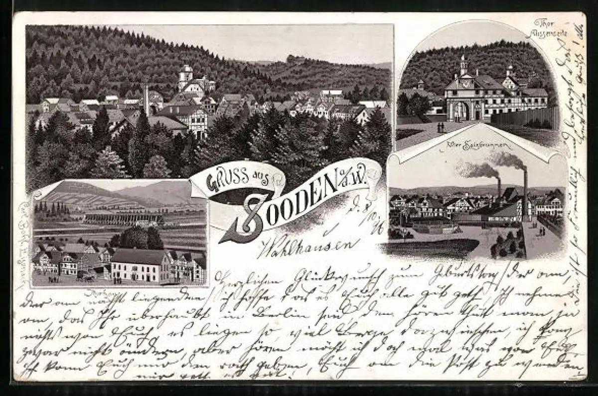 Lithographie Bad Sooden-Allendorf, alter Salzbrunnen, Kurhaus und Ortsansicht