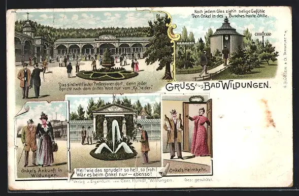 Lithographie Bad Wildungen, Onkel`s Ankunft, Blick auf Springbrunnen, Nach jedem Glas zieh`n selige Gefühle...