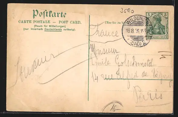 gelaufen 1906, Bugspuren mittig vertikal u. li. oben, guter Zustand