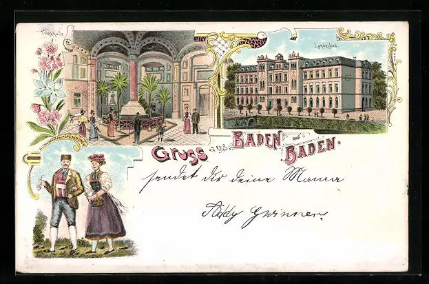 Lithographie Baden-Baden, Landesbad, Innenansicht, Paar in Tracht