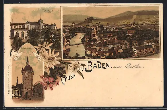 Lithographie Baden, Gefängnissturm, Kurhaus, Gesamtansicht