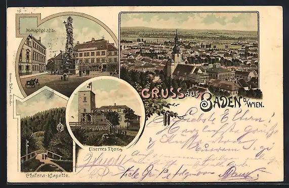 Lithographie Baden, Hauptplatz, Eisernes Tor, Ortsansicht