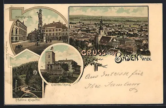 Lithographie Baden, Hauptplatz, Eisernes Tor, Totalansicht