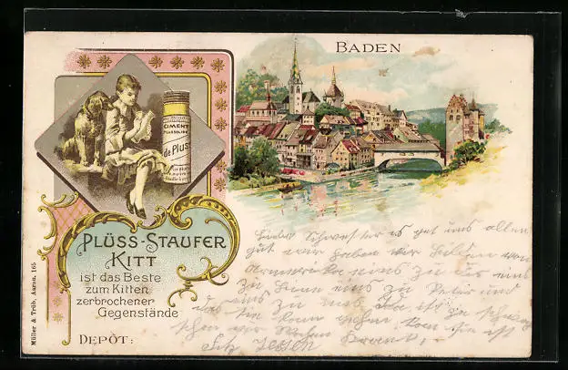 Lithographie Baden, Reklame Plüss-Staufer Kitt, Kind mit Hund, Ortsansicht