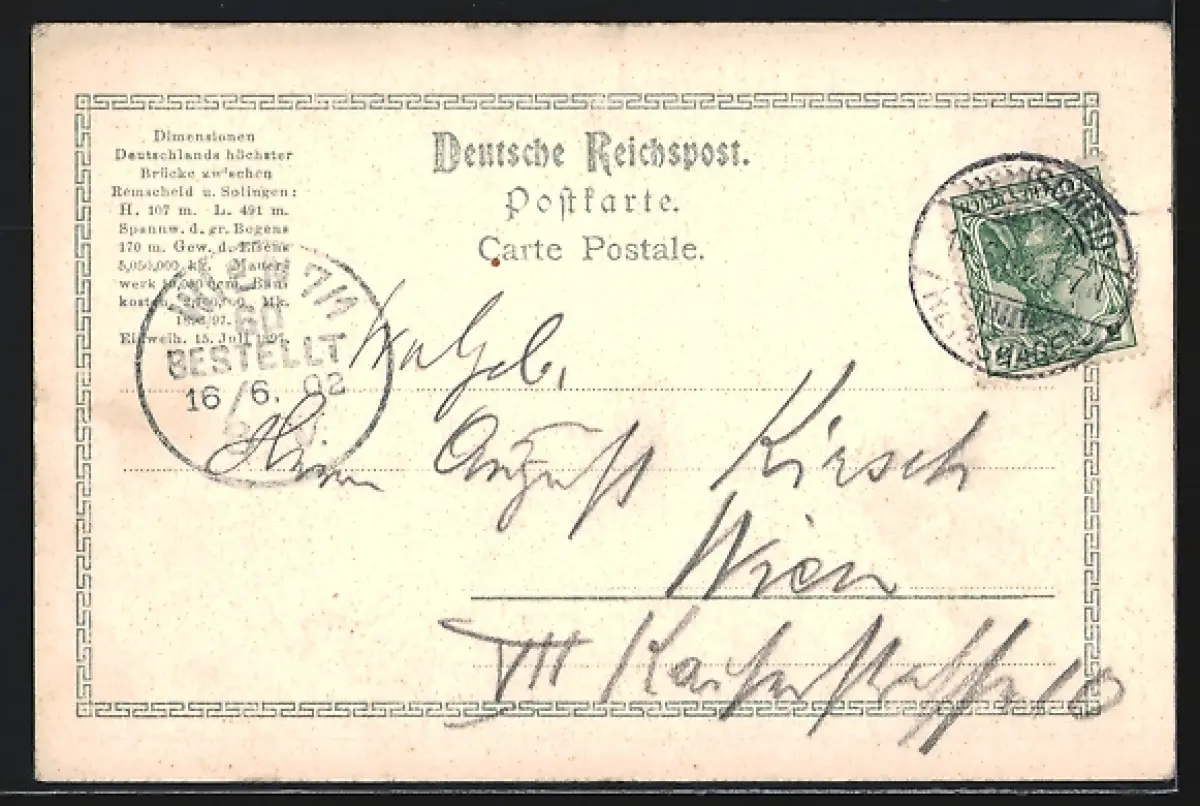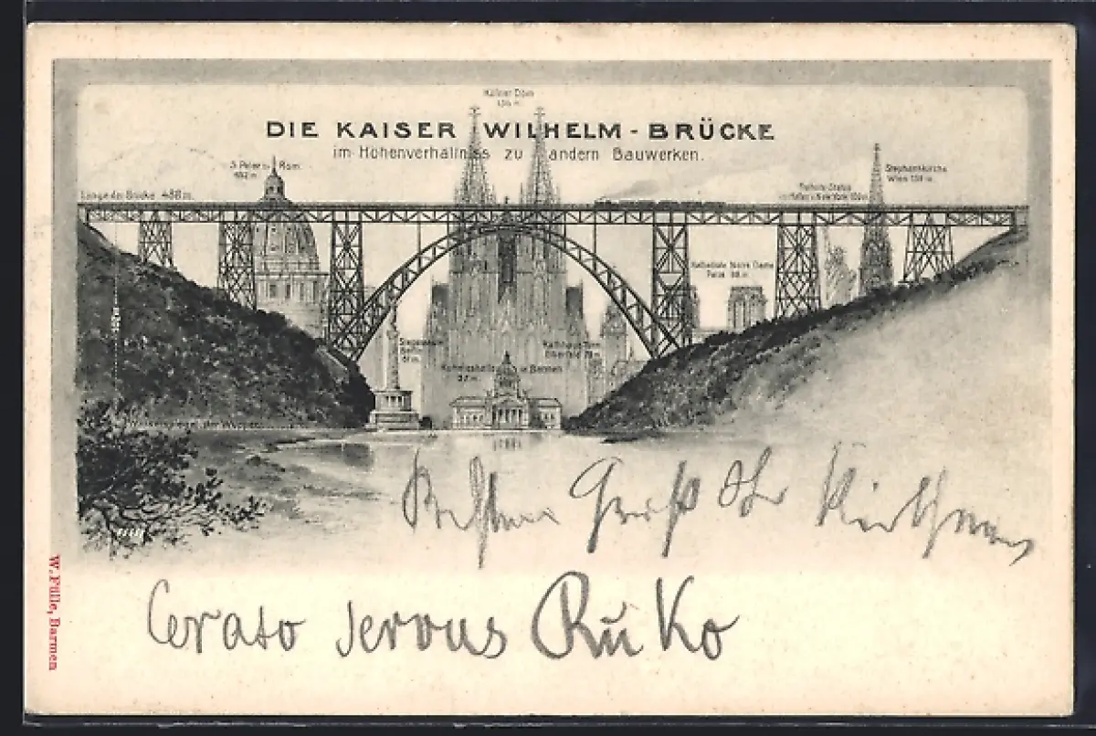 Lithographie Barmen, Kaiser Wilhelm-Brücke im Verhältnis zu anderen Bauten u. a. Kölner Dom & Wiener Stephanskirche