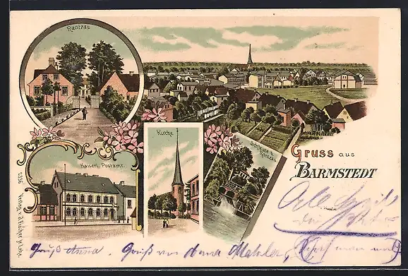 Lithographie Barmstedt, Kaiserl. Postamt, Schleuse b. Ranzau, Kirche