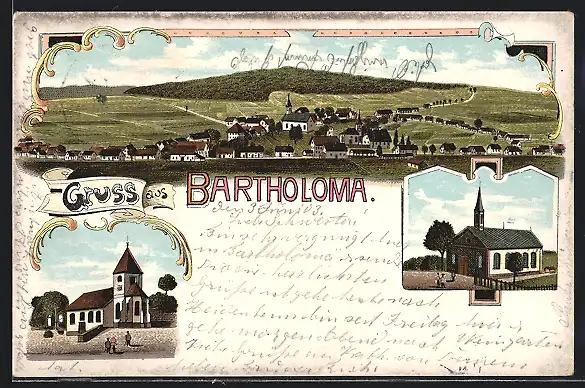 Lithographie Bartholomä, Kirchen, Ortsansicht mit Umgebung
