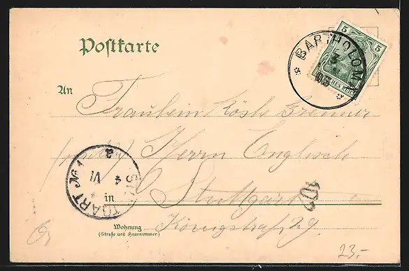 Personenbezogene Daten auf der Rückseite der Karte wurden durch blauen Textmarker unkenntlich gemacht. Die blauen Stellen sind auf die Vorderseite durchgeweicht und wirken sich negativ auf das Postkartenfoto aus