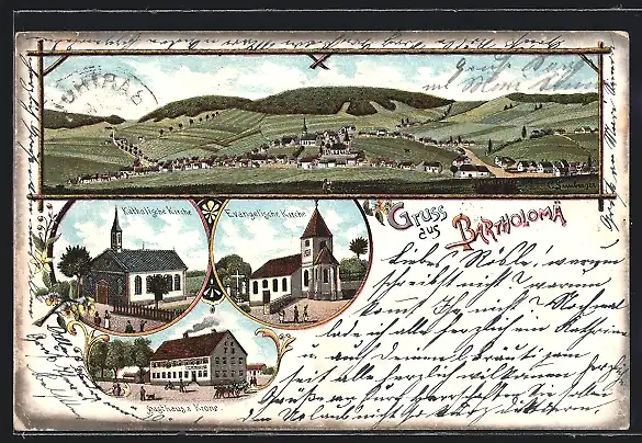 Lithographie Bartholomä, Ortsansicht, Gasthaus zur Krone, kath. und evang. Kirche