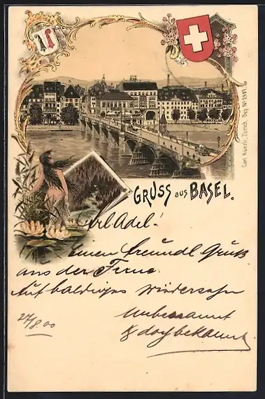 Lithographie Basel, Brücke mit Stadtpanorama, Wassernixe im Fluss, Wappen