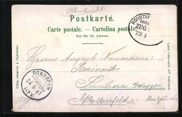 Personenbezogene Daten auf der Rückseite der Karte wurden durch blauen Textmarker unkenntlich gemacht. Die blauen Stellen sind auf die Vorderseite durchgeweicht und wirken sich negativ auf das Postkartenfoto aus