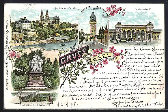 Lithographie Basel, Centralbahnhof, Münster mit der Pfalz, St. Albahnthor