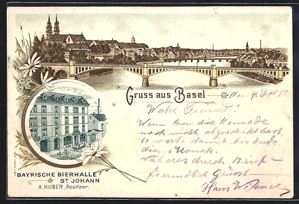 Lithographie Basel, Gasthaus Bayrische Bierhalle St. Johann v. A. Huber, Totalansicht