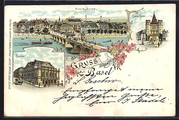 Lithographie Basel, Gesamtansicht Klein-Basel, Theater, Spalenthor