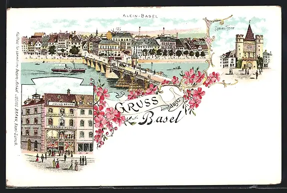 Lithographie Basel, Geschäft Julius Brann, Spalen-Tor, Dampfer passiert Klein-Basel