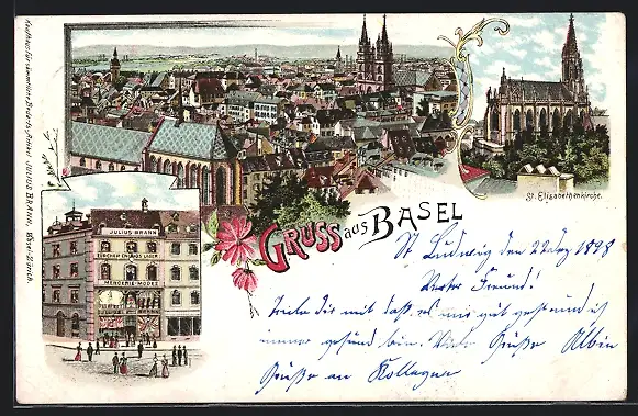 Lithographie Basel, Geschäftshaus Julius Brann, St. Elisabethenkirche, Panorama