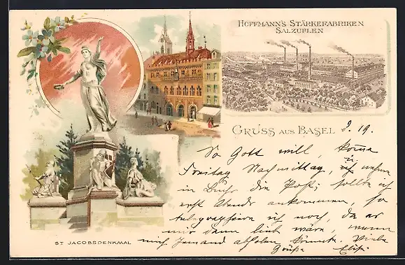 Lithographie Basel, Hoffmanns Stärkefabriken Salzuflen, St. Jakobsdenkmal, Gebäudeansicht