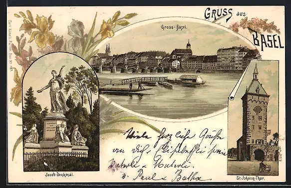 Lithographie Basel, Jacob-Denkmal, St. Johann Tor, Ansicht von Gross-Basel