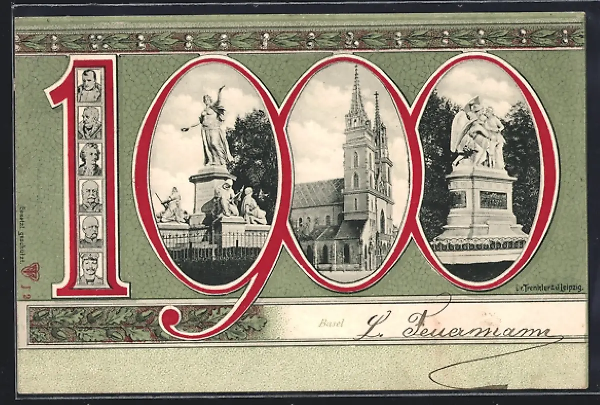 Lithographie Basel, Kirche, Denkmal und Napoleon in Jahreszahl 1900, Passepartout