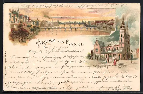Lithographie Basel, Kirche und Flusspartie mit Brücken