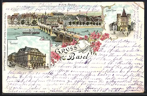 Lithographie Basel, Kleinbasel mit Theater und Spalentor