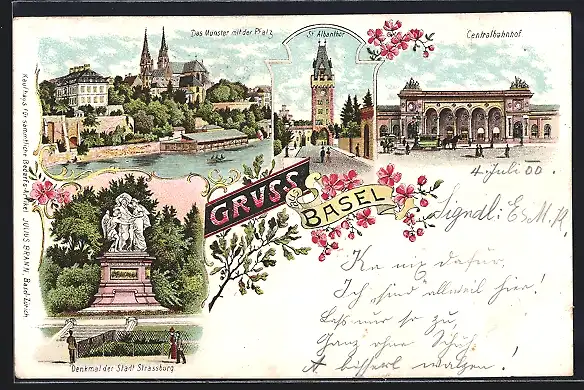 Lithographie Basel, Münster, Centralbahnhof, Denkmal der Stadt Strassburg