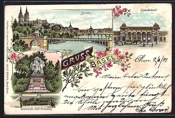 Lithographie Basel, Ortsansicht mit Rheinbrücke, Centralbahnhof, Denkmal der Stadt Strassburg