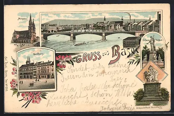 Lithographie Basel, Rathaus, Münster, St. Jacobs-Denkmal