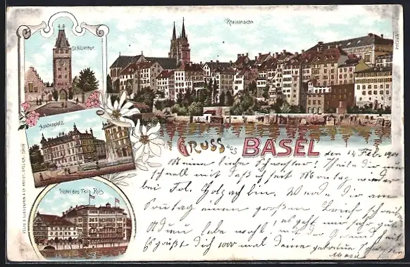 Lithographie Basel, Rheinansicht, St. Albanthor, Aeschenplatz und Hotel des Ruis