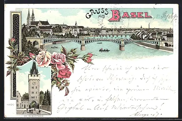 Lithographie Basel, St. Albanthor, Rheinpartie